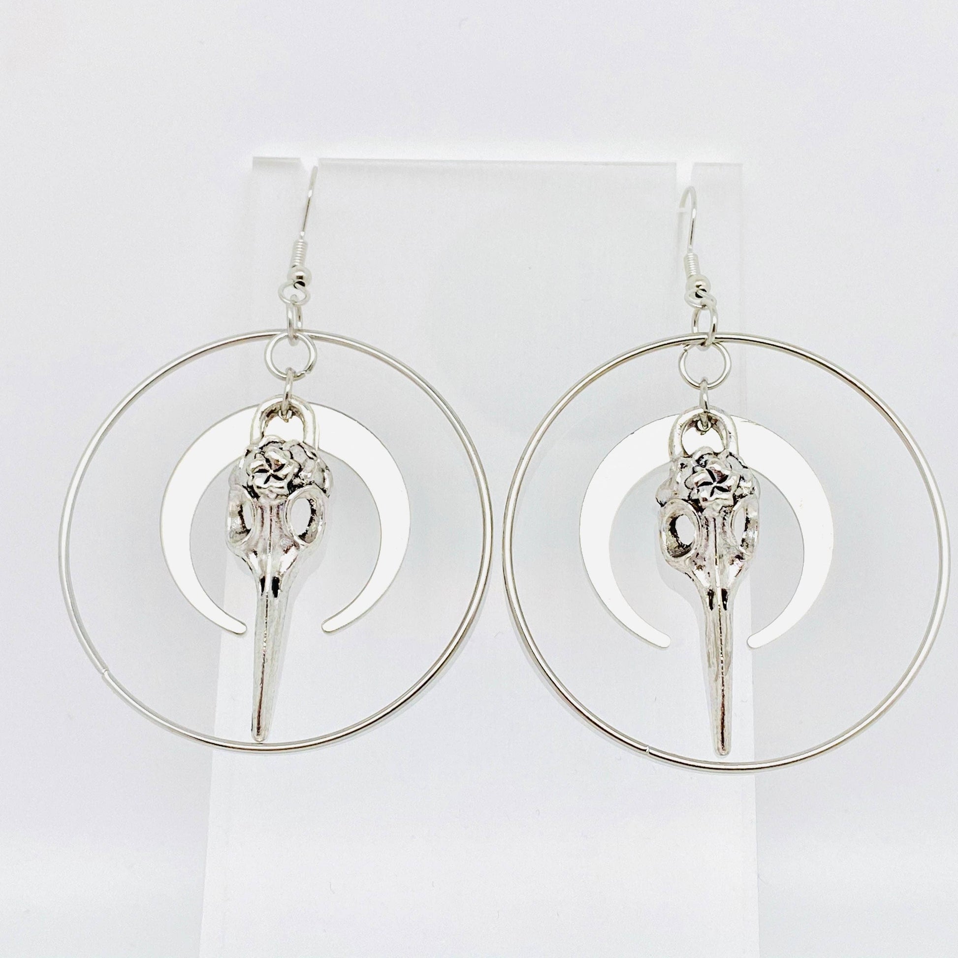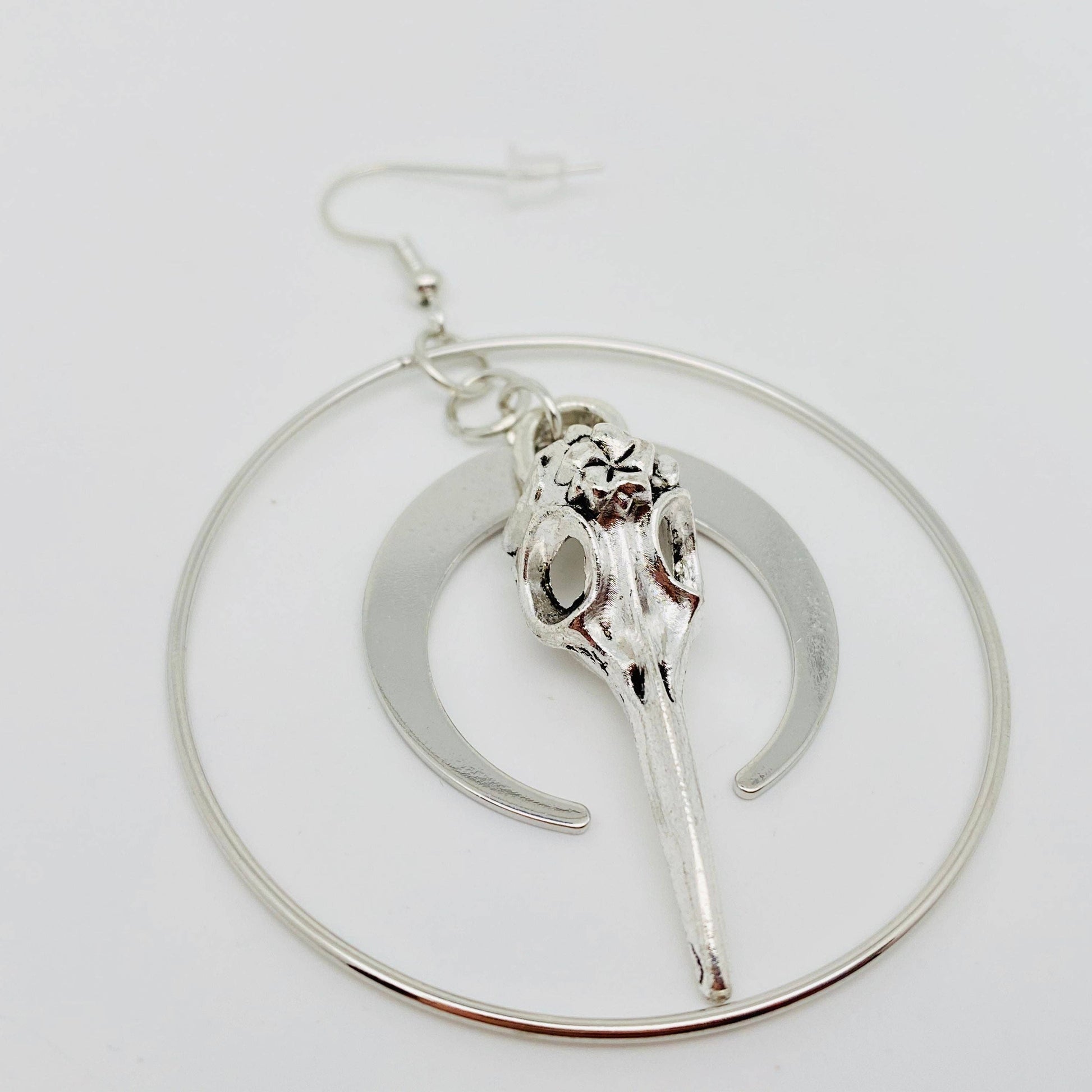 Moon and Skull Pendant Gothic Earrings - Silver